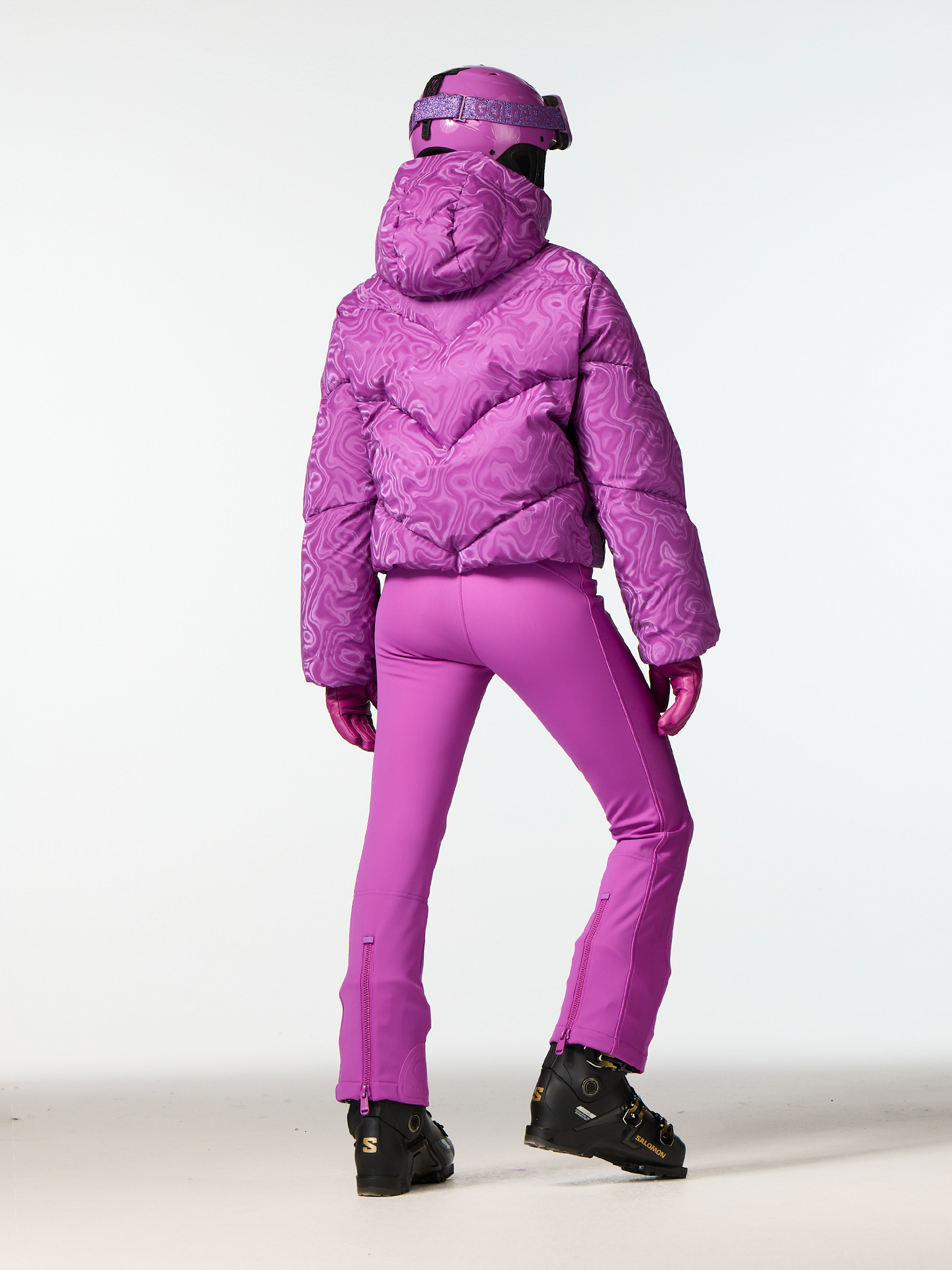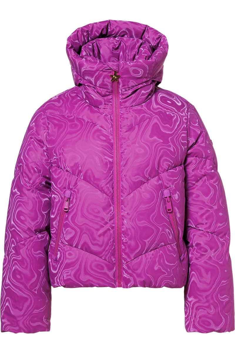 Goldbergh Aeliana Jacket is a swirl damask down jacket designed with an oversized fit. Made with a partly recycled lining finished with anti-odor technology, it is insulated with RDS-certified 90/10 duck down for lightweight warmth. Functional details include a detachable snowcatcher, knitted cuffs at the inner sleeves, inside carry straps, two outer pockets, two inner pockets, and a sleeve pocket for a ski pass. The fixed hood completes this performance-driven style. Length: 58 cm (22.8 in) at center back for EU 38 (US 08)