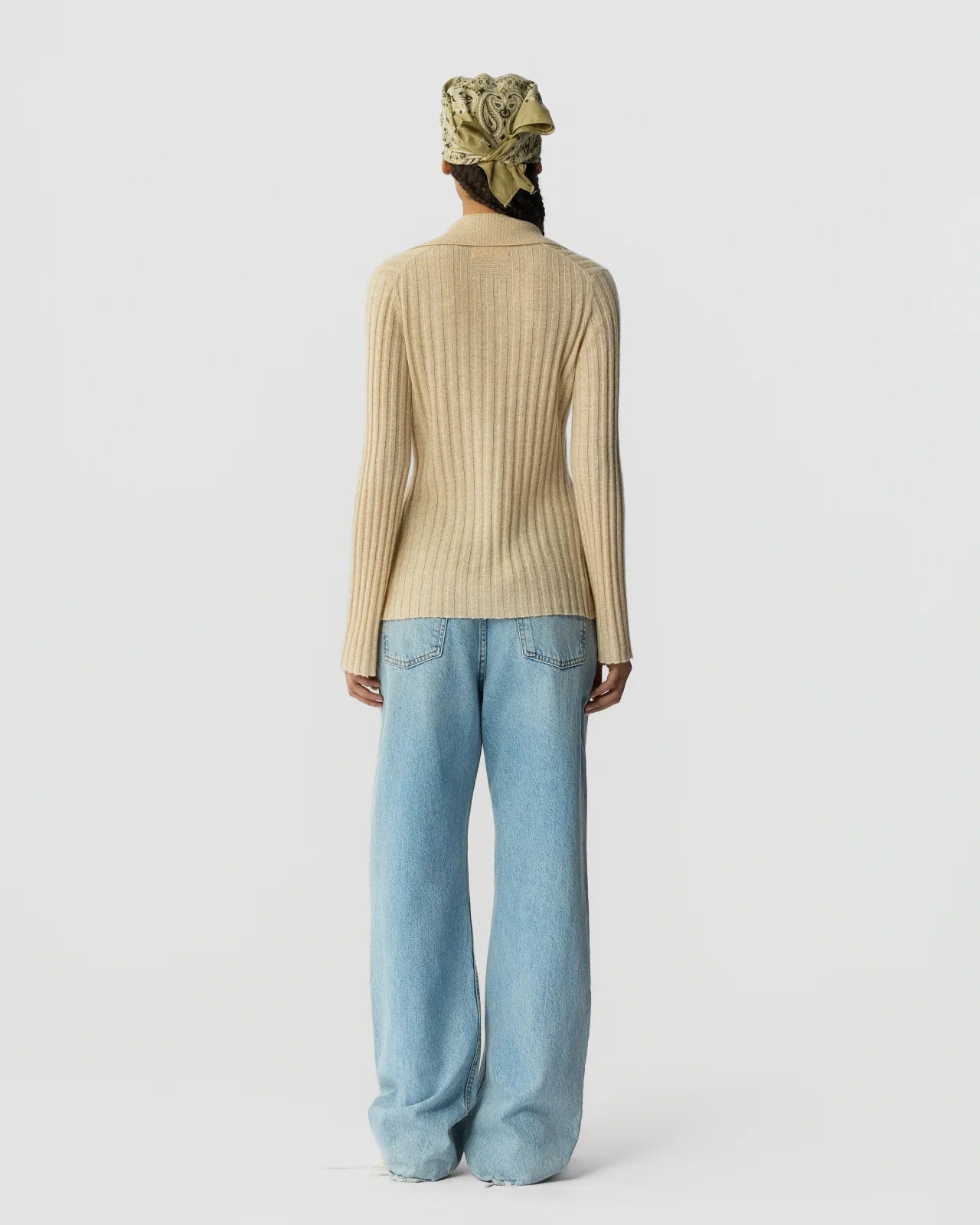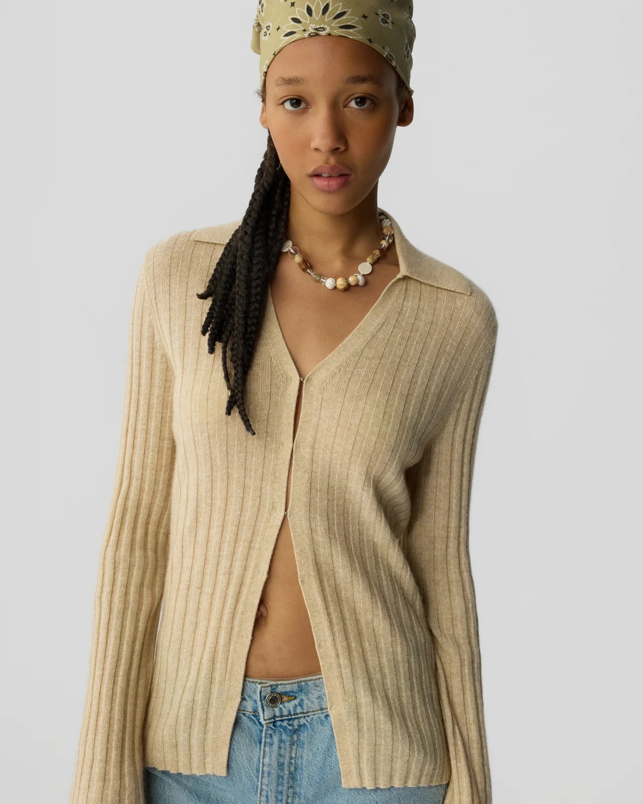 The Breezy Cardigan is a women’s lightweight cashmere–linen cardigan featuring a ribbed texture, V-neckline, and polo-style collar. Finished with a hidden hook-and-eye closure, this breathable knit layers beautifully.