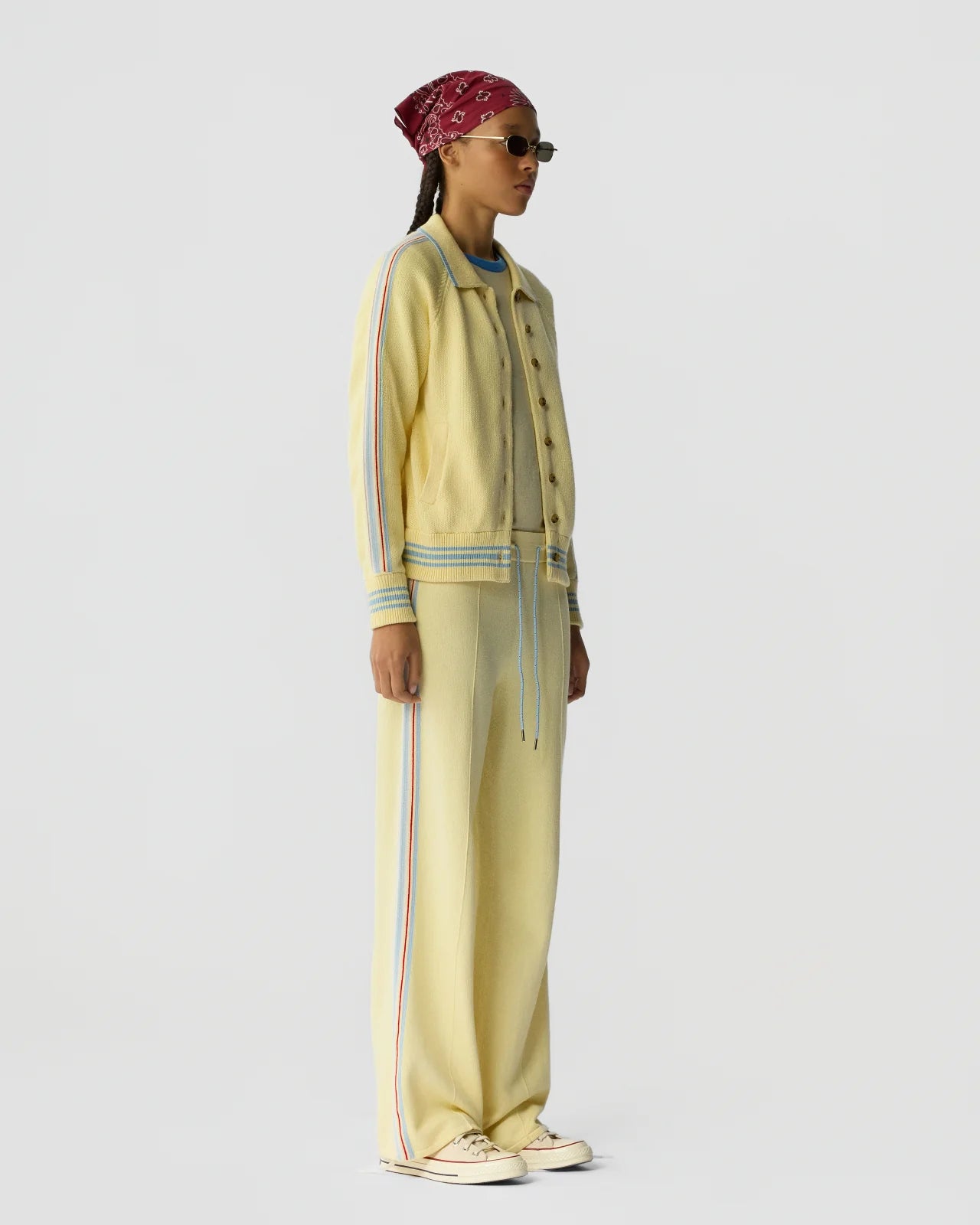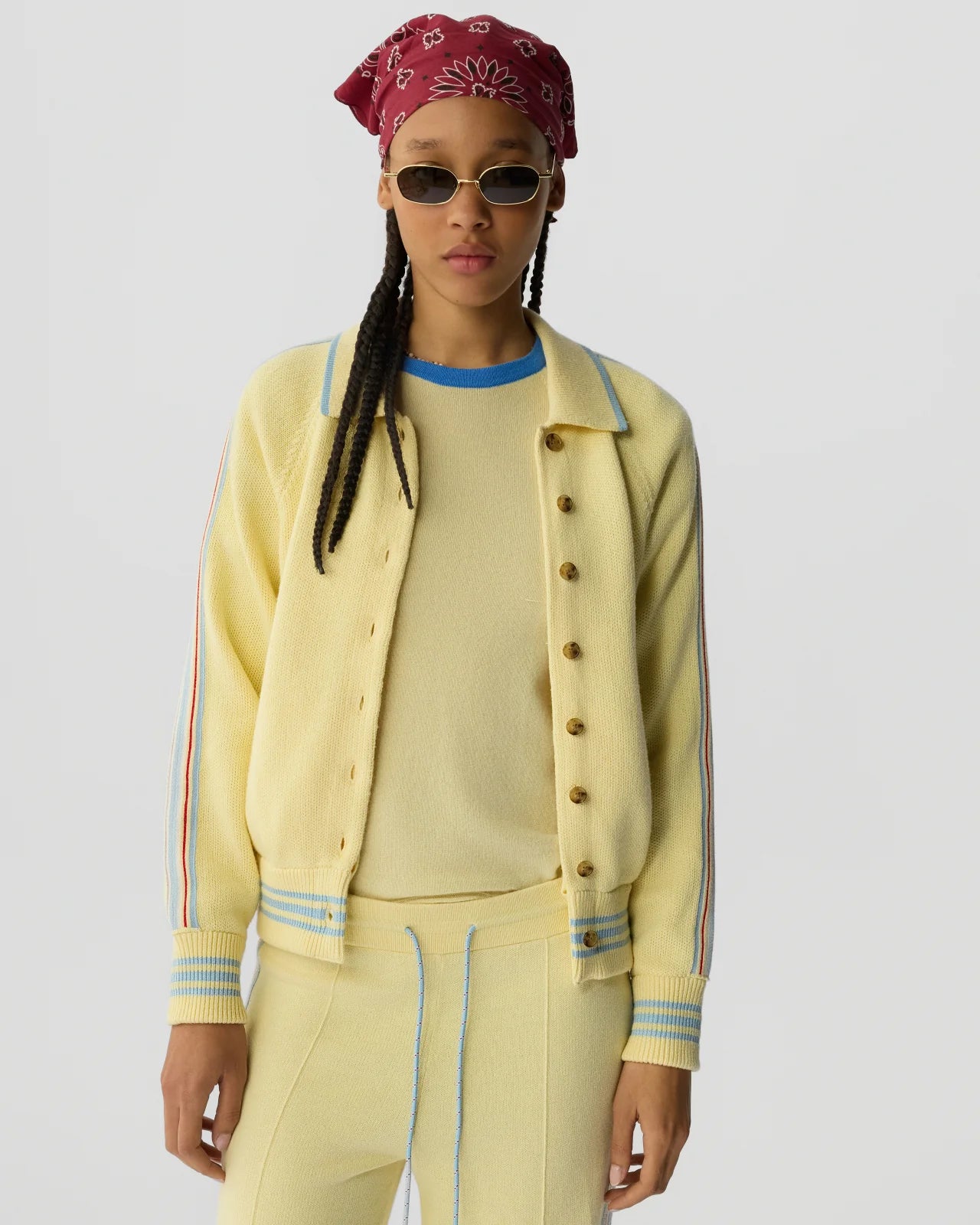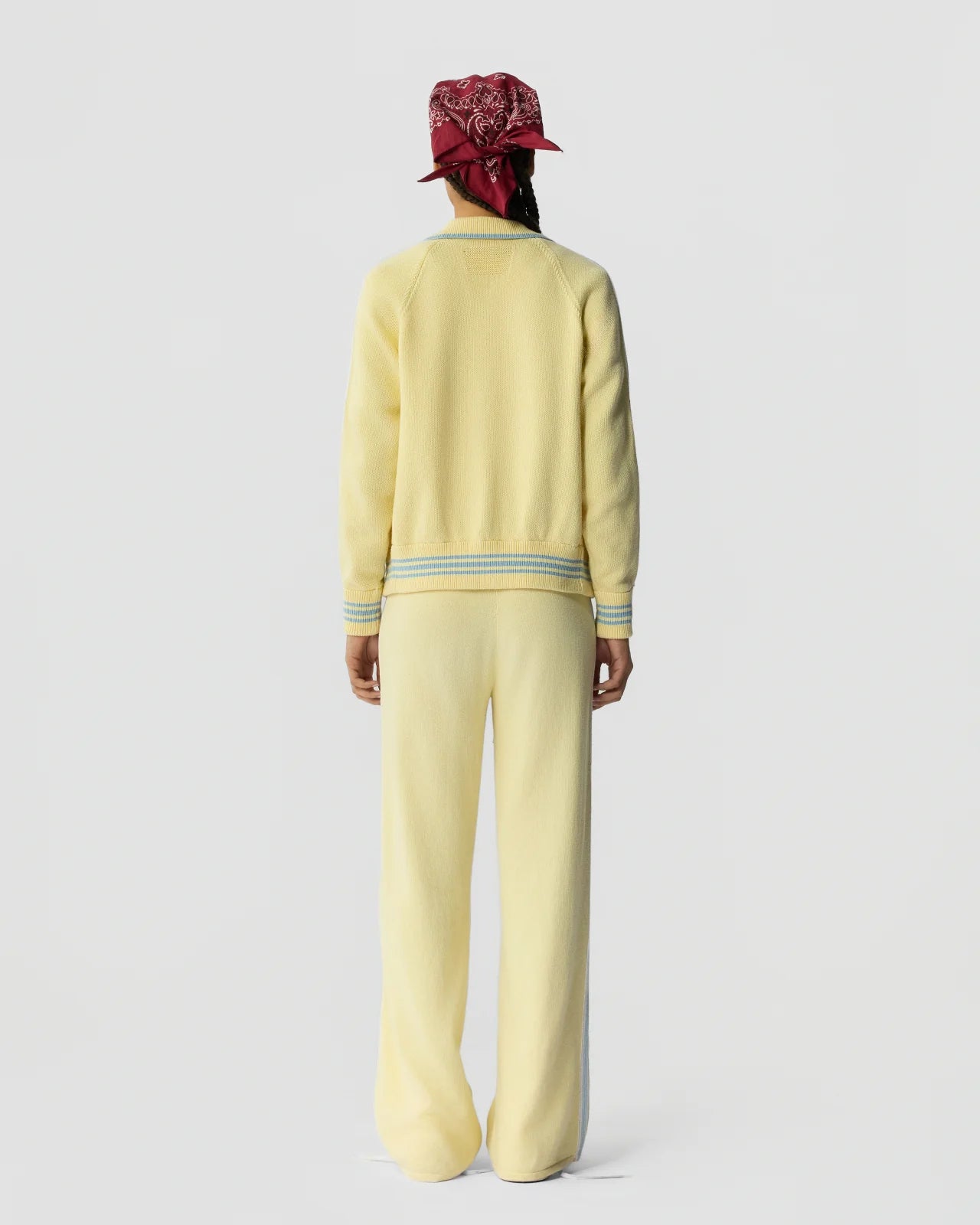A women’s varsity jacket crafted from a soft cotton–cashmere knit, featuring athletic stripes and ribbed trim. Designed to layer effortlessly over the Baseball Tee and pair with the matching Track Pant for a comfortable, sport-inspired outfit.