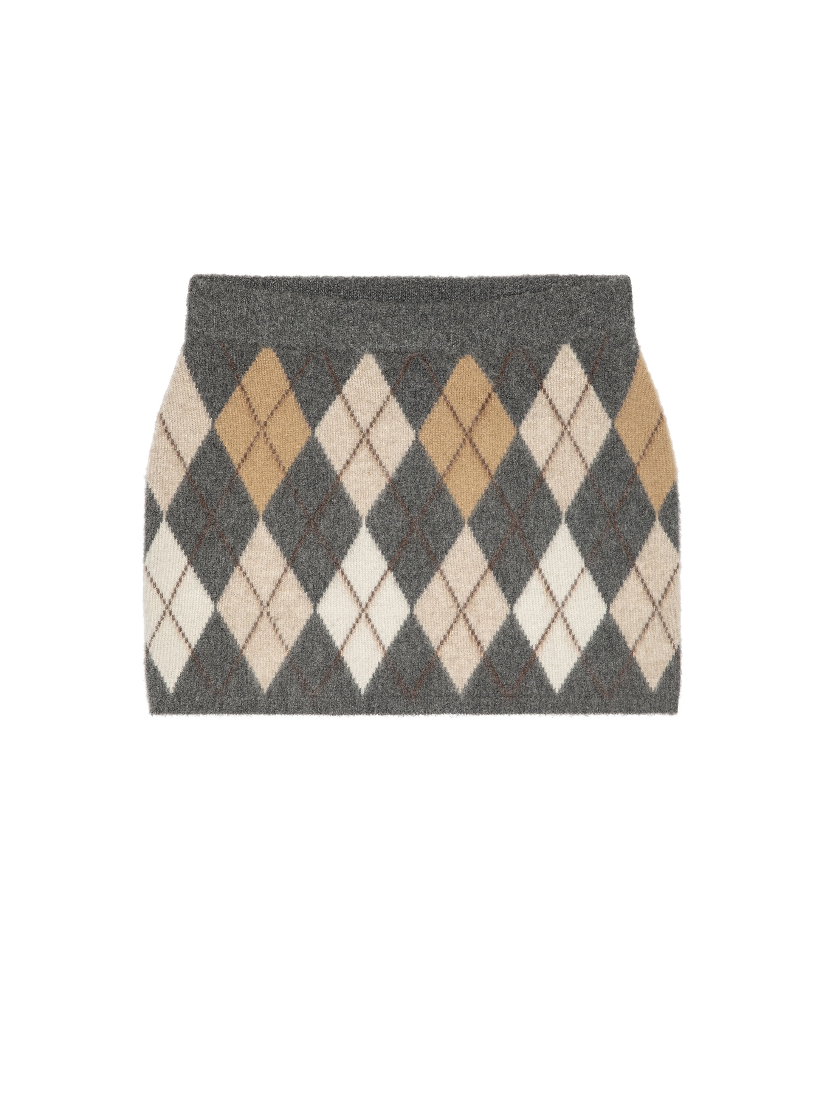 The Brushed Argyle Skirt is crafted from a soft merino wool–cashmere blend, featuring a mini-length silhouette with a comfortable elastic waistband and classic argyle pattern.