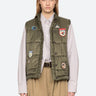 The Eira quilted puffer vest reimagines utilitarian style with a playful spirit, featuring custom ski-inspired 'Sea' patches, a high neck, and a streamlined silhouette for a modern alpine aesthetic.