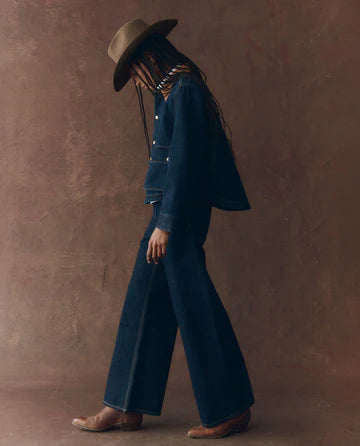 Inspired by heritage-style barn jackets, this reproduction has been reinterpreted with more interesting proportions. It features a cropped length that is longer at the back, creating a charming swing shape. The jacket is made of a structured rinse denim with a corduroy collar that adds authentic detailing. It also includes a snap-front closure with a hidden front zipper, along with traditionally pleated, three-dimensional pockets and snaps at the flap closure.